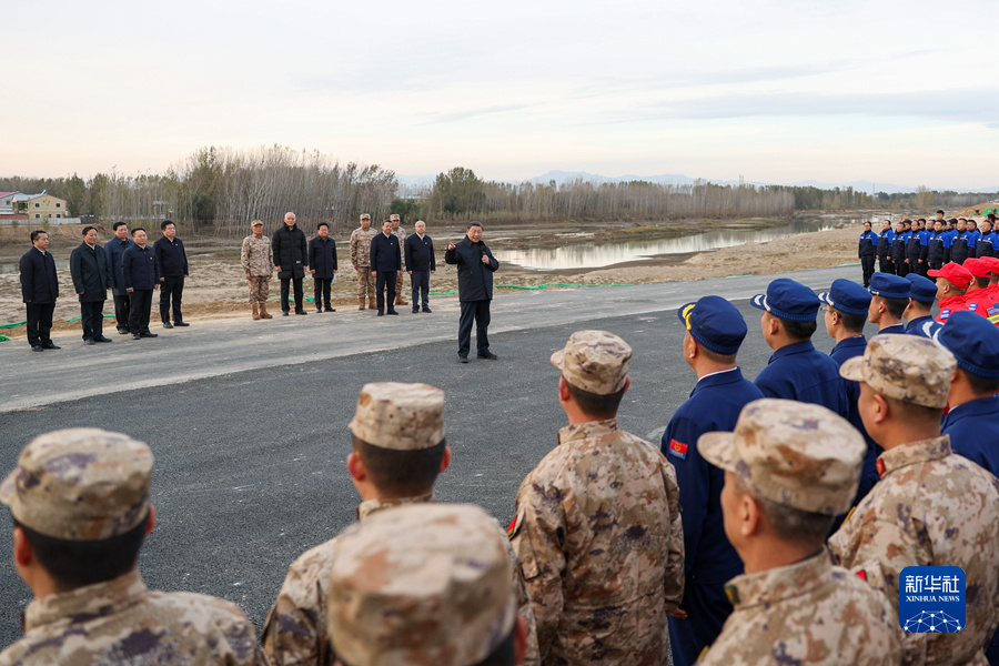 11月10日,中共中央总书记、国家主席、中央军委主席习近平在北京、河北考察灾后恢复重建工作。这是10日下午,习近平在河北保定涿州市白沟河治理工程(涿州段)考察时,同水利工程建设人员和曾经参加涿州抗洪救援的解放军和武警部队官兵、民兵预备役人员、消防救援队伍等方面的代表亲切交流。新华社记者 岳月伟 摄